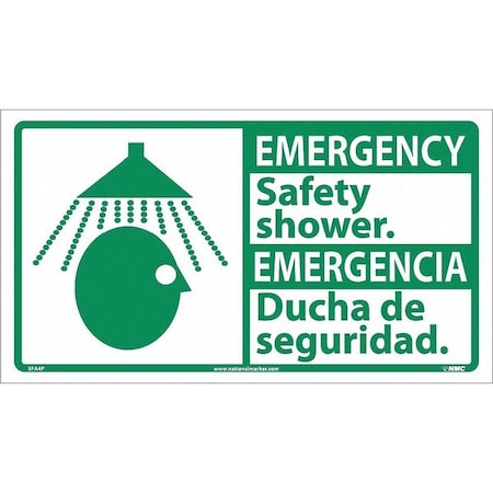 NMC SFA4P Bilingual OSHA Sign, Legend "EMERGENCY- Safety shower" with Graphic, 18" Length x 10" Height, Pressure Sensitive Vinyl, Green on White