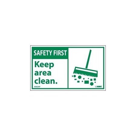 NMC SGA2AP OSHA Sign, Legend "SAFETY FIRST - Keep area clean." with Graphic, 5" Length x 3" Height, Pressure Sensitive Vinyl, Green on White (Pack of 5)