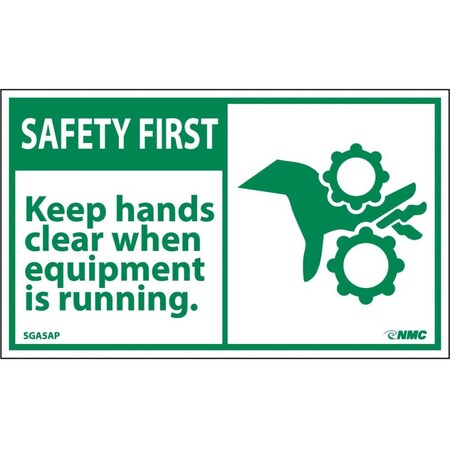NMC SGA5AP OSHA Sign, Legend "SAFETY FIRST - Keep hands clear when equipment is running." with Graphic, 5" Length x 3" Height, Pressure Sensitive Vinyl, Green on White (Pack of 5)