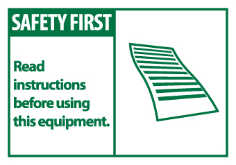 - Header "SAFETY FIRST" and legend "Read instructions before using this equipment." with graphic