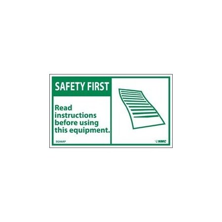 NMC SGA6AP OSHA Sign, Legend "SAFETY FIRST - Read instructions before using this equipment." with Graphic, 5" Length x 3" Height, Pressure Sensitive Vinyl, Green on White (Pack of 5)