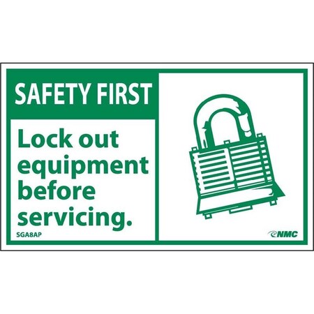 NMC SGA8AP OSHA Sign, Legend "SAFETY FIRST - Lockout equipment before servicing." with Graphic, 5" Length x 3" Height, Pressure Sensitive Vinyl, Green on White (Pack of 5)