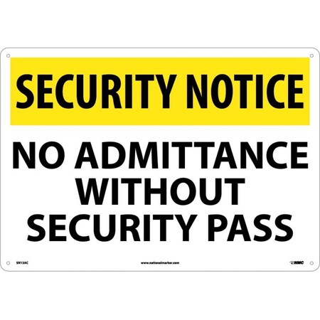 NMC SN13AC Security Sign, Legend "SECURITY NOTICE - NO ADMITTANCE WITHOUT SECURITY PASS", 20" Length x 14" Height, Aluminum, Yellow/Black on White