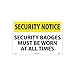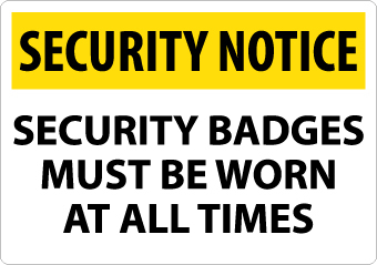 - Clear Visibility: the sign shows the legend “SECURITY NOTICE - SECURITY BADGES MUST BE WORN AT ALL TIMES” in contrasting colors and clear, bold letters to ensure easy visibility in most lighting conditions and even from a distance