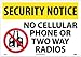 | Feature | Header "SECURITY NOTICE" and legend "NO CELLULAR PHONE OR TWO WAY RADIOS" with graphic |
