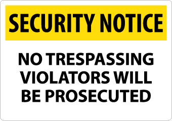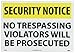 - Specifications: the SECURITY NOTICE - NO TRESPASSING VIOLATORS WILL BE PROSECUTED signage is made up of lightweight aluminum and measures - 20 in. length by 14 in. height