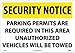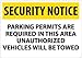 - Header "SECURITY NOTICE" and legend "PARKING PERMITS ARE REQUIRED IN THIS AREA UNAUTHORIZED VEHICLES WILL BE TOWED"