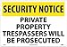 - Clear Visibility: the legend “SECURITY NOTICE - PRIVATE PROPERTY TRESPASSERS WILL BE PROSECUTED” is printed in bold and legible text to ensure better visibility even from a distance