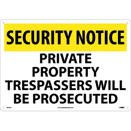 NMC SN27AC Security Sign, Legend "SECURITY NOTICE - PRIVATE PROPERTY TRESPASSERS WILL BE PROSECUTED", 20" Length x 14" Height, Aluminum, Yellow/Black on White