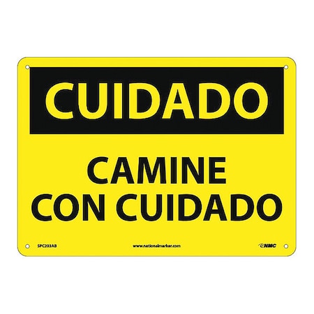 NMC SPC203AB OSHA Sign, Legend "CUIDADO - CAMINE CON CUIDADO", 14" Length x 10" Height, Aluminum, Black on Yellow