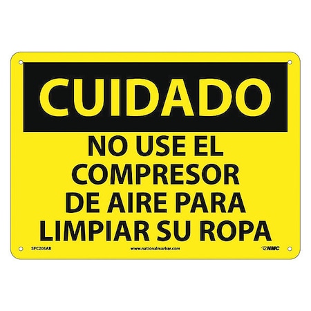 NMC SPC205AB OSHA Sign, Legend "CUIDADO - NO USE EL COMPRESOR DE AIRE PARA LIMPIAR SU ROPA", 14" Length x 10" Height, Aluminum, Black on Yellow