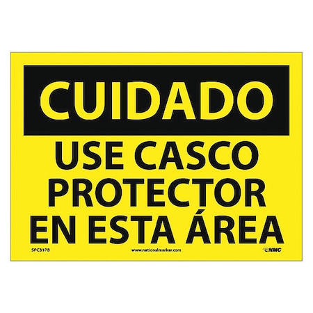 NMC SPC31PB OSHA Sign, Legend "CUIDADO - USE CASCO PROTECTOR EN ESTA AREA", 14" Length x 10" Height, Pressure Sensitive Vinyl, Black on Yellow