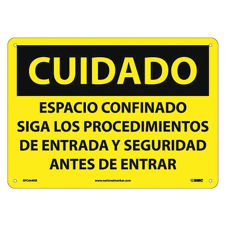 NMC SPC444RB OSHA Sign, Legend "CUIDADO - ESPACIO CONFINADO SIGA LOS PROCEDIMIENTOS DE ENTRADA Y SEGURIDAD ANTES DE ENTRAR", 14" Length x 10" Height, Rigid Plastic, Black on Yellow