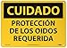 - Header "CUIDADO" and legend "PROTECCION DE LOS OIDOS REQUERIDA"