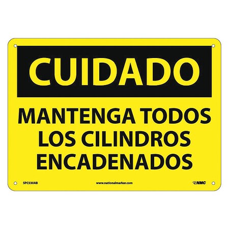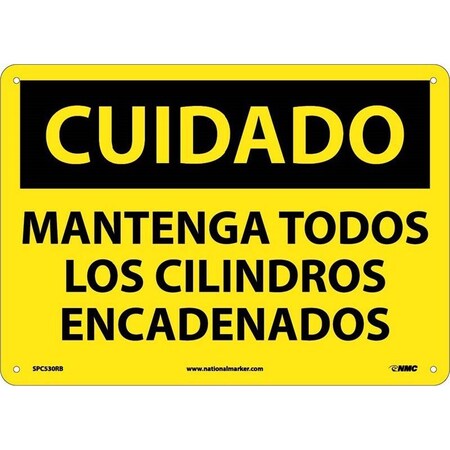 NMC SPC530AB OSHA Sign, Legend "CUIDADO - MANTENGA TODOS LOS CILINDROS ENCADENADOS", 14" Length x 10" Height, Aluminum, Black on Yellow