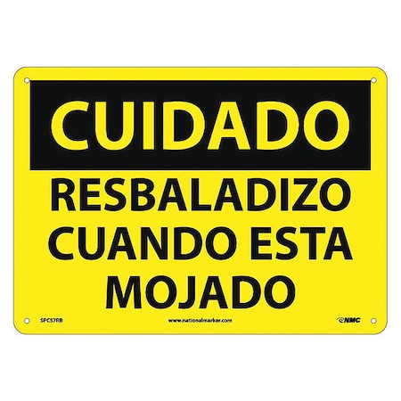 NMC SPC57RB OSHA Sign, Legend "CUIDADO - RESBALADIZO CUANDO ESTA MOJADO", 14" Length x 10" Height, Rigid Plastic, Black on Yellow