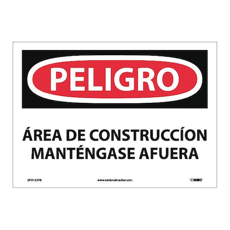 NMC SPD132PB OSHA Sign, Legend "PELIGRO - AREA DE CONSTRUCCION MANTENGASE AFUERA", 14" Length x 10" Height, Pressure Sensitive Vinyl, Black/Red on White