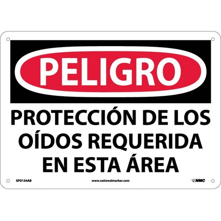 NMC SPD134AB OSHA Sign, Legend "PELIGRO - PROTECCION DE LOS OIDOS REQUERIDA EN ESTA AREA", 14" Length x 10" Height, Aluminum, Black/Red on White