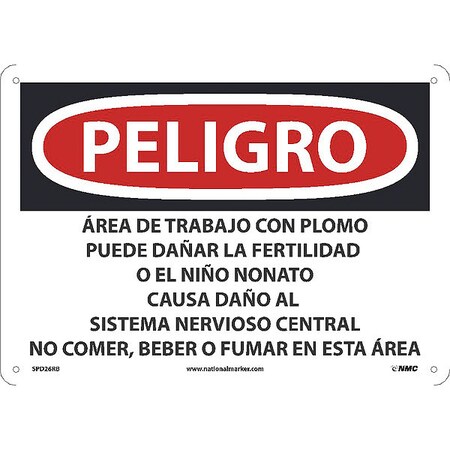 NMC National Marker SPD26RB Peligro Lead Work Area May Damage Fertility Or The Unborn Child, Do Not Eat, Drink Or Smoke in This Area(Spanish), 10" x 14", Rigid Plastic, Sign