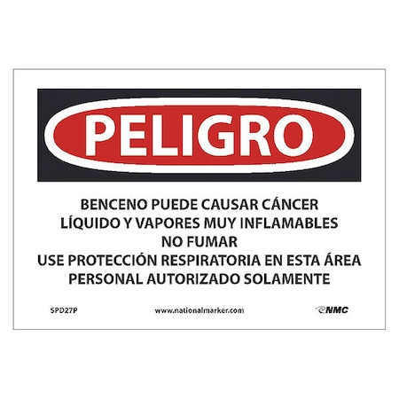 NMC's SPD27P Peligro Benzene May Cause Cancer Highly Flammable Liquid and Vapor, Wear Respiratory Protection in This Area Authorized Personnel Only (Spanish) Sign, 7 Inch X 10 Inch, PS Vinyl