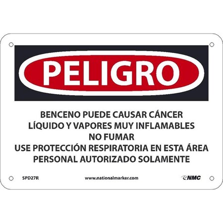 OSHA Sign SPD27 Legend: Peligro Benzene May Cause Cancer Highly Flammable Liquid and Vapor Do Not Smoke Wear Respiratory Protection In This Area Authorized Personnel Only (spanish)