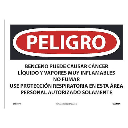NMC's SPD27PB Peligro Benzene May Cause Cancer Highly Flammable Liquid and Vapor, Wear Respiratory Protection in This Area Authorized Personnel Only (Spanish) Sign, 10 Inch X 14 Inch, PS Vinyl