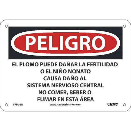NMC's SPD36A Peligro Lead May Damage Fertility Or The Unborn Child Causes Damage to The Central Nervous System Do Not Eat, Drink Or Smoke in This Area (Spanish) Sign, 7 Inch X 10 Inch, 0.040 Alum