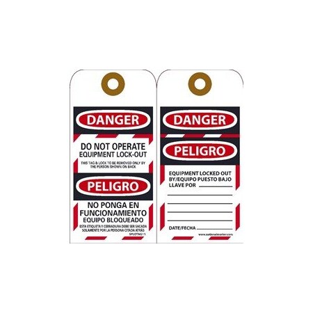 - Tag Legend: the front side legend reads DANGER - DO NOT OPERATE - THIS TAG & LOCK TO BE REMOVED ONLY BY THE PERSON SHOWN ON BACK. The back-side legend is DANGER - EQUIPMENT LOCKED OUT BY. The legends are printed in both English and Spanish