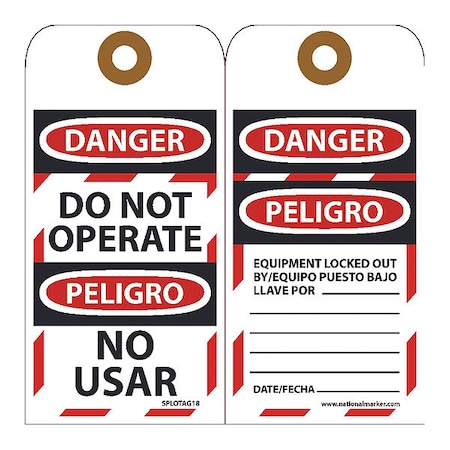- Tag Legend: the front side legend reads DANGER - DO NOT OPERATE. The back-side legend is DANGER - EQUIPMENT LOCKED OUT BY. The legends are printed in both English and Spanish