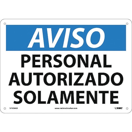 NMC SPN34AB OSHA Sign, Legend "AVISO - PERSONAL AUTORIZADO SOLAMENTE", 14 Length x 10" Height, Aluminum, Blue/Black on White