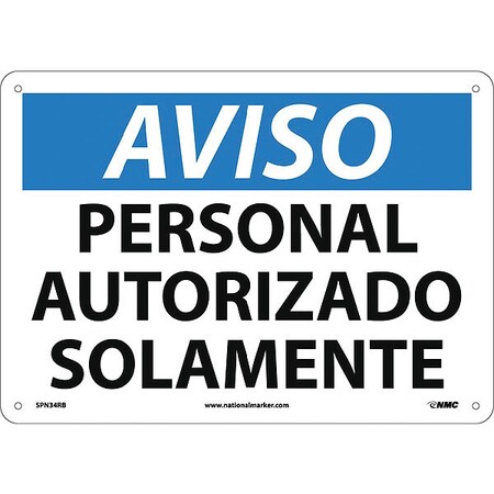 NMC SPN34RB OSHA Sign, Legend "AVISO - PERSONAL AUTORIZADO SOLAMENTE", 14 Length x 10" Height, Rigid Plastic, Blue/Black on White