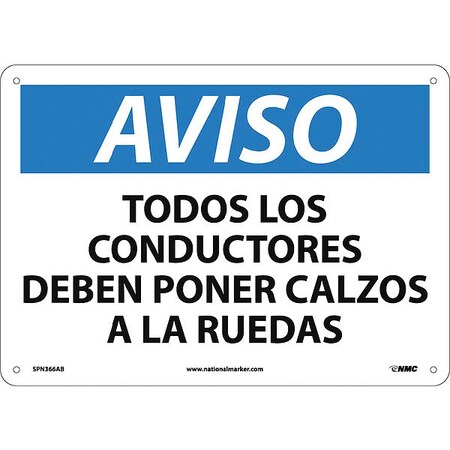 NMC SPN366AB OSHA Sign, Legend "AVISO - TODOS LOS CONDUCTORES DEBEN PONER CALZOS A LAS RUEDAS", 14 Length x 10" Height, Aluminum, Blue/Black on White