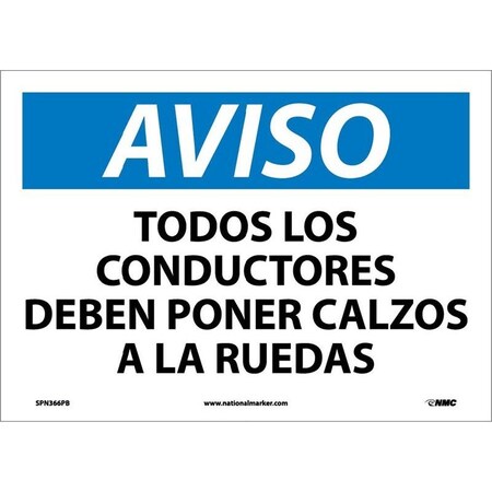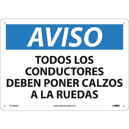 NMC SPN366RB OSHA Sign, Legend "AVISO - TODOS LOS CONDUCTORES DEBEN PONER CALZOS A LAS RUEDAS", 14 Length x 10" Height, Rigid Plastic, Blue/Black on White
