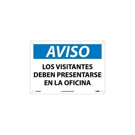 NMC SPN369AB OSHA Sign, Legend "AVISO - LOS VISITANTES DEBEN PRESENTARSE EN LA OFICINA", 14 Length x 10" Height, Aluminum, Blue/Black on White