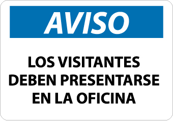 NMC SPN369RB OSHA Sign, Legend "AVISO - LOS VISITANTES DEBEN PRESENTARSE EN LA OFICINA", 14 Length x 10" Height, Rigid Plastic, Blue/Black on White