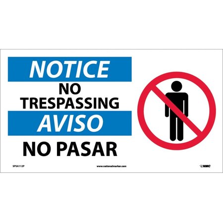 Notice - No Trespassing, 18" Wide x 10" High, Pressure Sensitive Vinyl Safety SignEnglish/Spanish, Rectangular, 0.004" Thick, for Security and Admittance