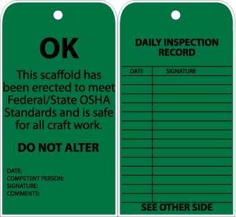 - Tag Legend: the front side legend reads OK - DO NOT ALTER. The back-side legend is DAILY INSPECTION RECORD. The message is printed in contrasting colors to ensure clear visibility and easy readability