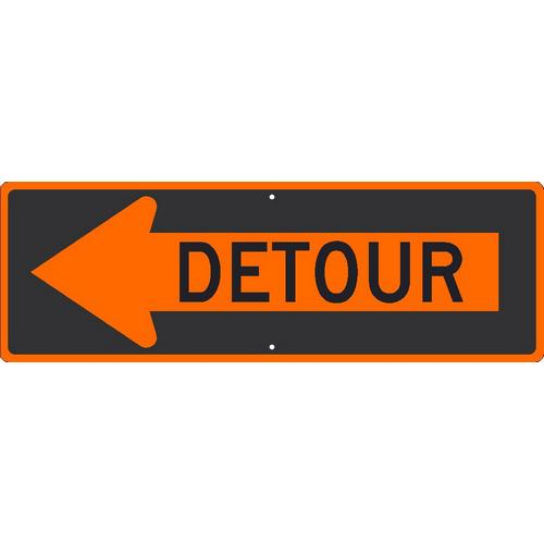 - Visibility: the traffic control sign shows the left arrow graphic with the legend “DETOUR” in contrasting colors to ensure clear visibility in most lighting conditions and even from a distance