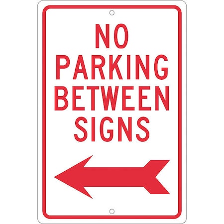 NMC TM31H Traffic Sign, Legend "NO PARKING BETWEEN SIGNS" with Left Arrow Graphic, 12" Length x 18" Height, 0.063 Aluminum, Red On White