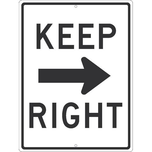 - Visibility: the sign shows the legend “KEEP RIGHT” and a right arrow graphic in contrasting colors to ensure easy visibility from a distance. The clear, bold letters and reflective sheeting make the sign visible in most lighting conditions