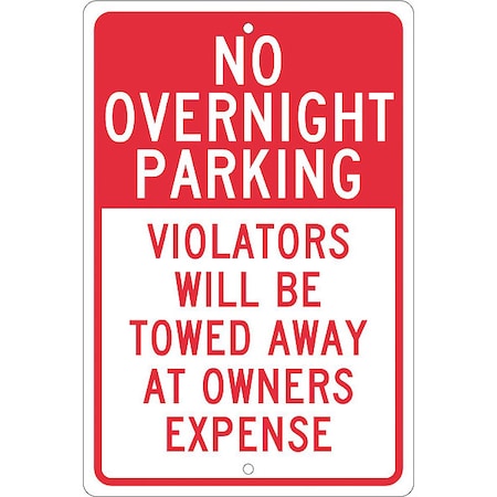 NMC TM57H Traffic Sign, Legend "NO OVERNIGHT PARKING VIOLATORS WILL BE TOWED AWAY AT OWNER'S EXPENSE", 12" Length x 18" Height, 0.063 Aluminum, Red On White