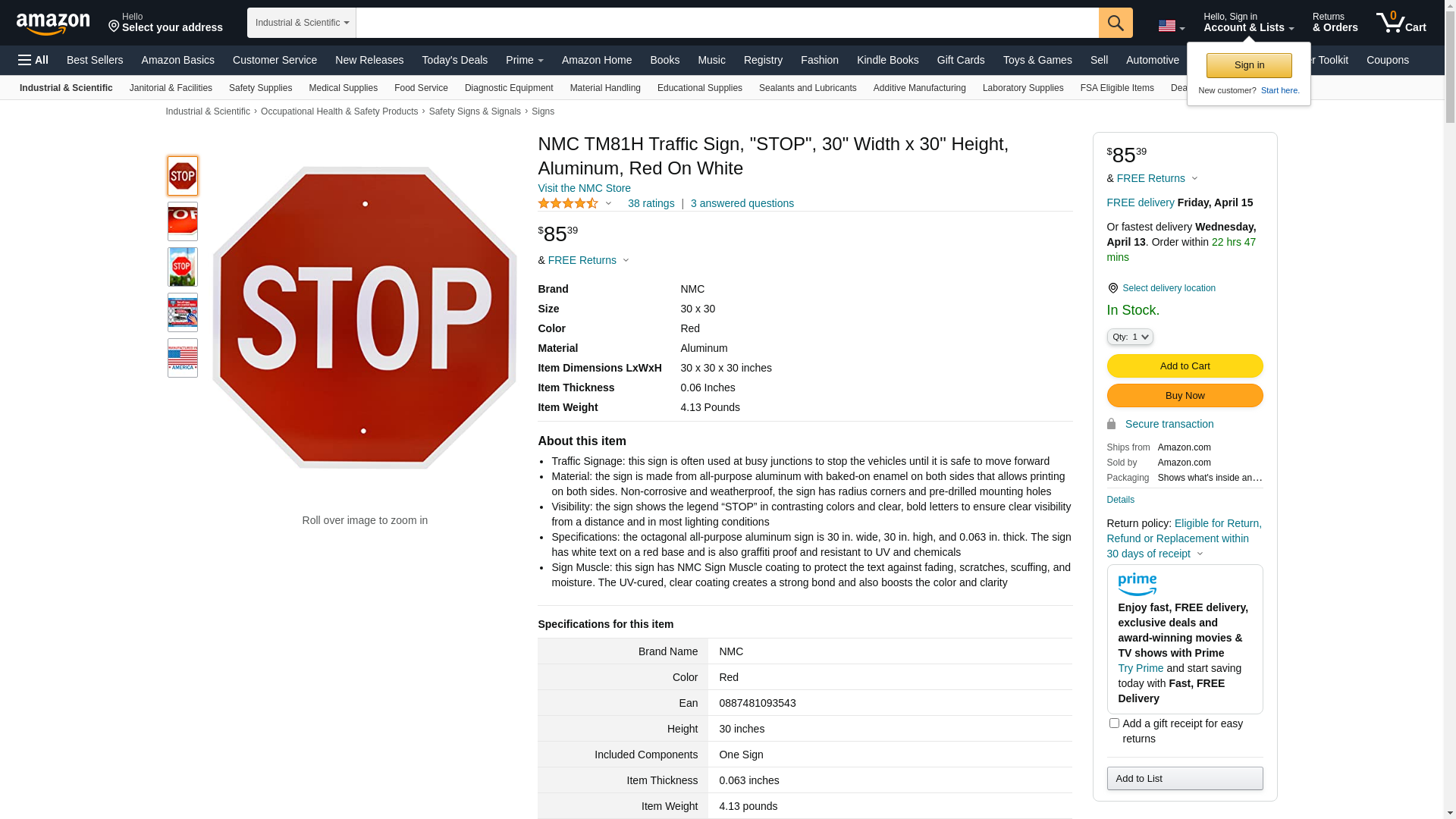 NMC TM81H Traffic Sign, "STOP", 30" Width x 30" Height, Aluminum, Red On White