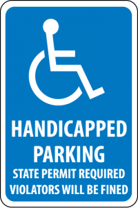 - Visibility: the sign shows the handicap graphic and “HANDICAPPED PARKING STATE PERMIT REQUIRED VIOLATORS WILL BE FINED” legend in contrasting colors and clear, bold letters to ensure clear visibility from a distance and in most lighting conditions