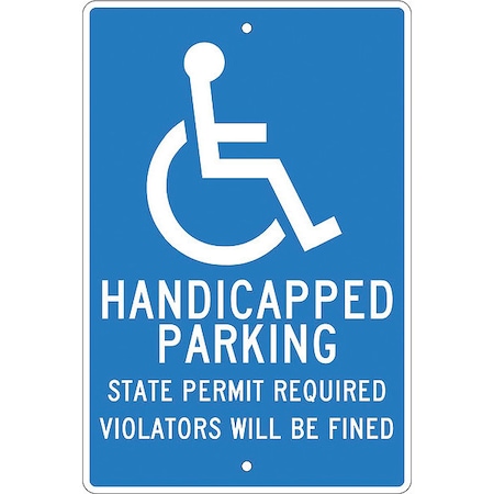 NMC TM90H Handicap Parking Sign, Legend "HANDICAPPED PARKING STATE PERMIT REQUIRED Violators WILL BE FINED" with Handicapped Symbol, 12" Length x 18" Height, Aluminum 0.063, White on Blue