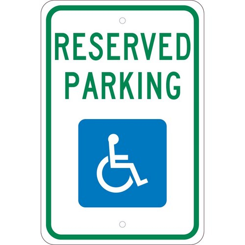 - High Visibility: the sign shows the graphic, and legend “RESERVED PARKING” in clear, bold letters to ensure maximum visibility. The sign has a wheelchair graphic to reinforce the message