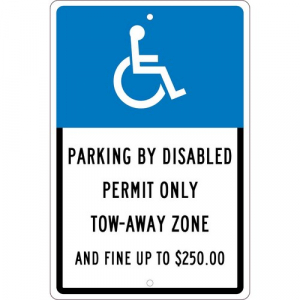 - Visibility: the sign shows the graphic, and legend “PARKING BY DISABLED PERMIT ONLY - TOW AWAY ZONE AND FINE UP TO $250” in clear, bold letters to ensure clear visibility. The reflective sheeting makes the sign visible in most lighting conditions
