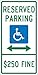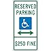 - Visibility: the sign shows the graphic, and legend “RESERVED PARKING - $250 FINE” in clear, bold letters to ensure clear visibility. The reflective sheeting makes the sign visible in most lighting conditions