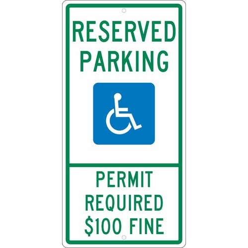 Traffic & Parking Signs; MessageType: ADA Signs ; Message or Graphic: Message & Graphic ; Legend: Reserved Parking Permit Required $100 Fine ; Graphic Type: Handicap Symbol ; Reflectivity: NonReflective ; Material: Aluminum