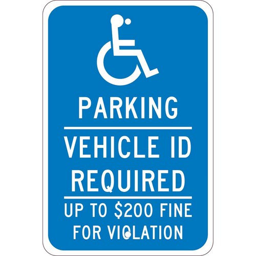 - Visibility: the sign shows the graphic, and legend “PARKING - VEHICLE ID REQUIRED - UP TO $200 FINE FOR VIOLATION” in clear, bold letters to ensure clear visibility. The reflective sheeting makes the sign visible in most lighting conditions