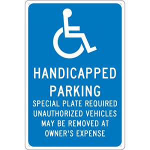 - Visibility: the sign shows the graphic, and legend “HANDICAPPED PARKING - SPECIAL PLATE REQUIRED” in clear, bold letters to ensure clear visibility. The reflective sheeting makes the sign visible in most lighting conditions
